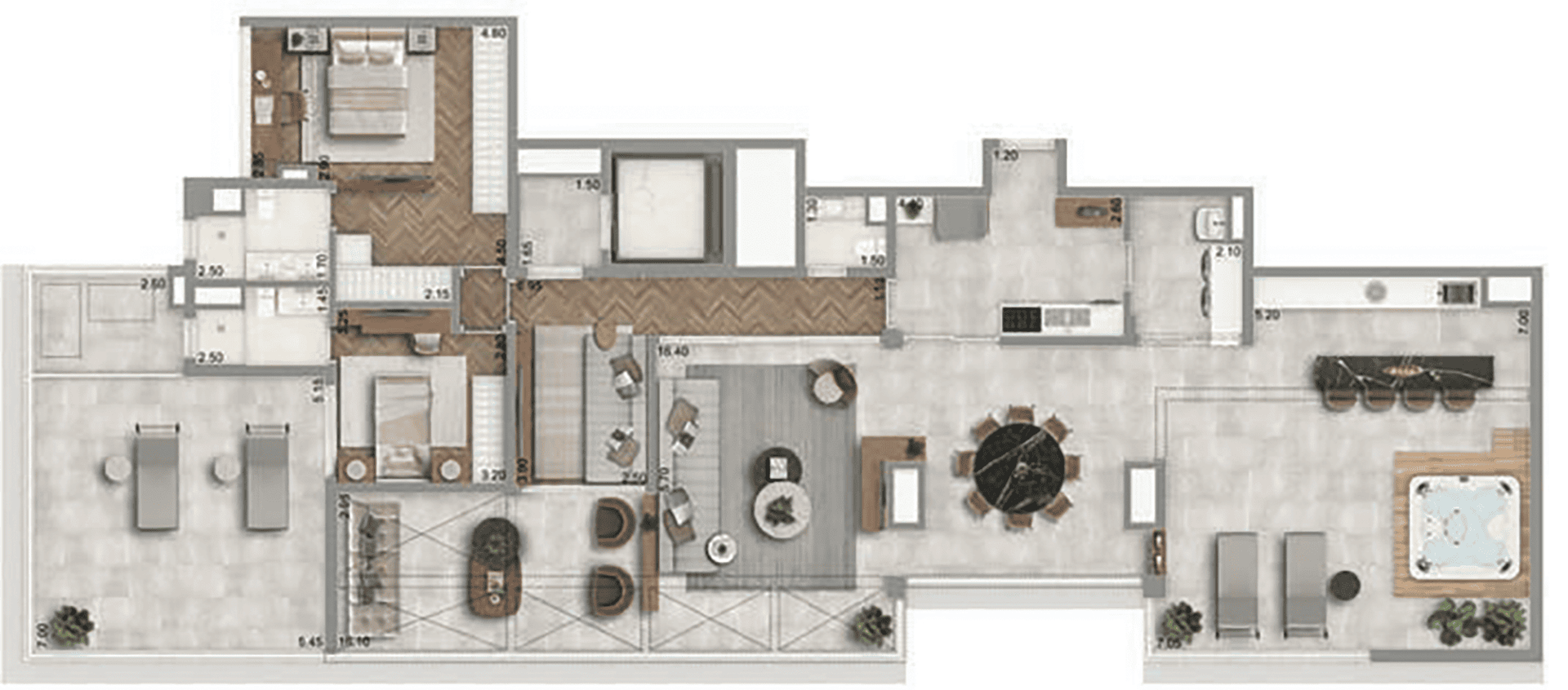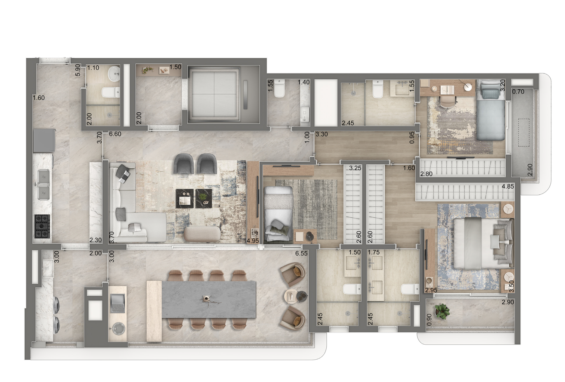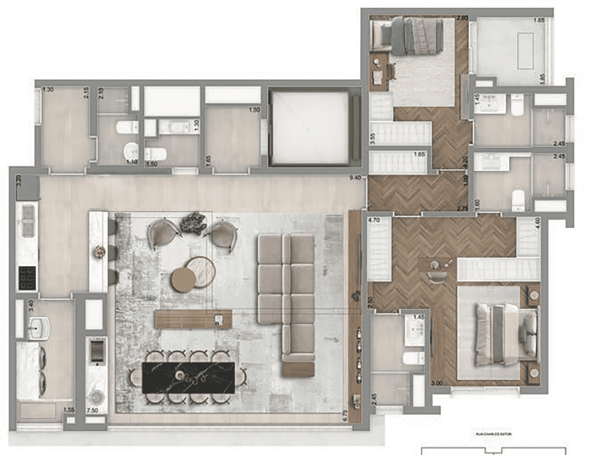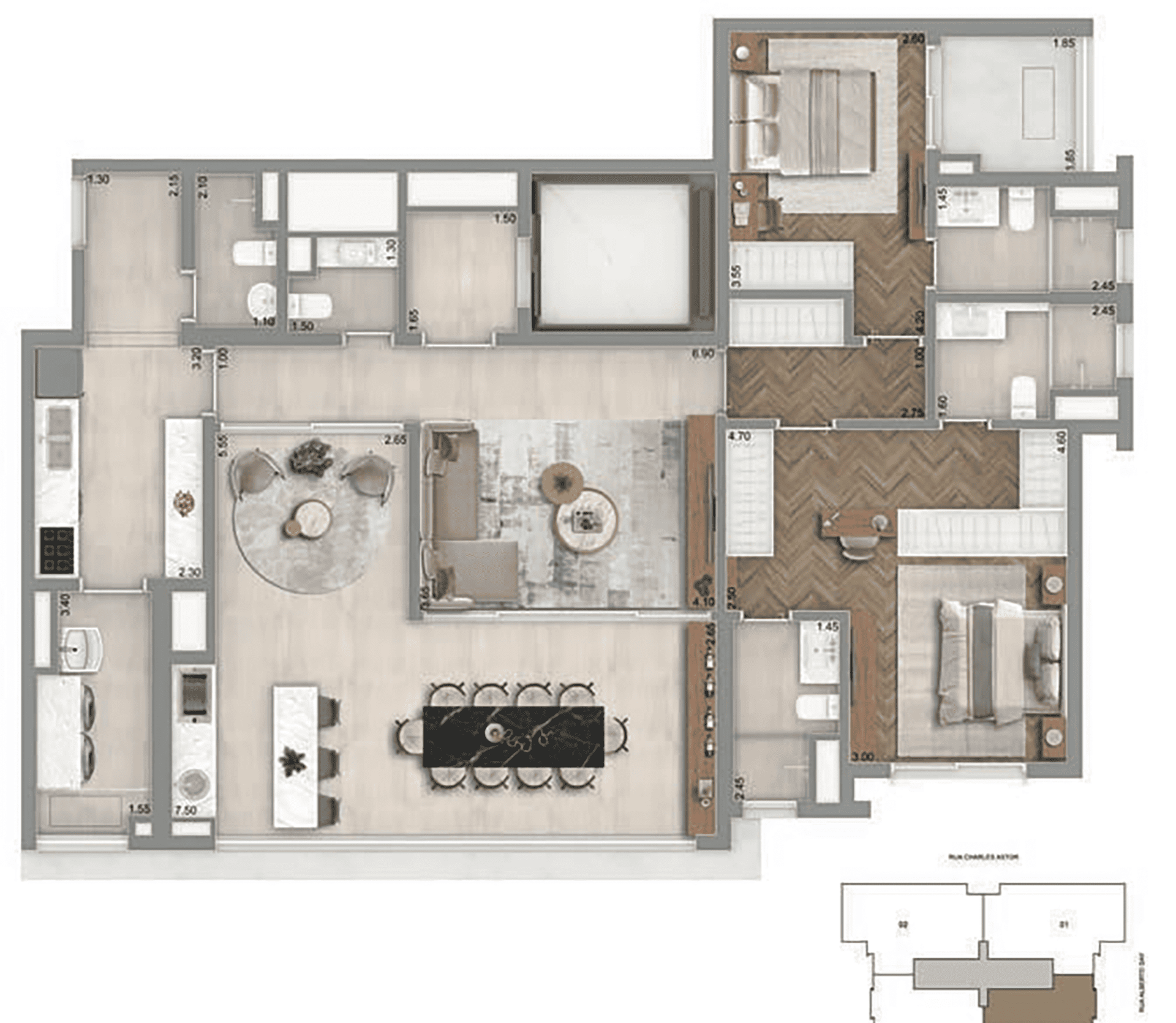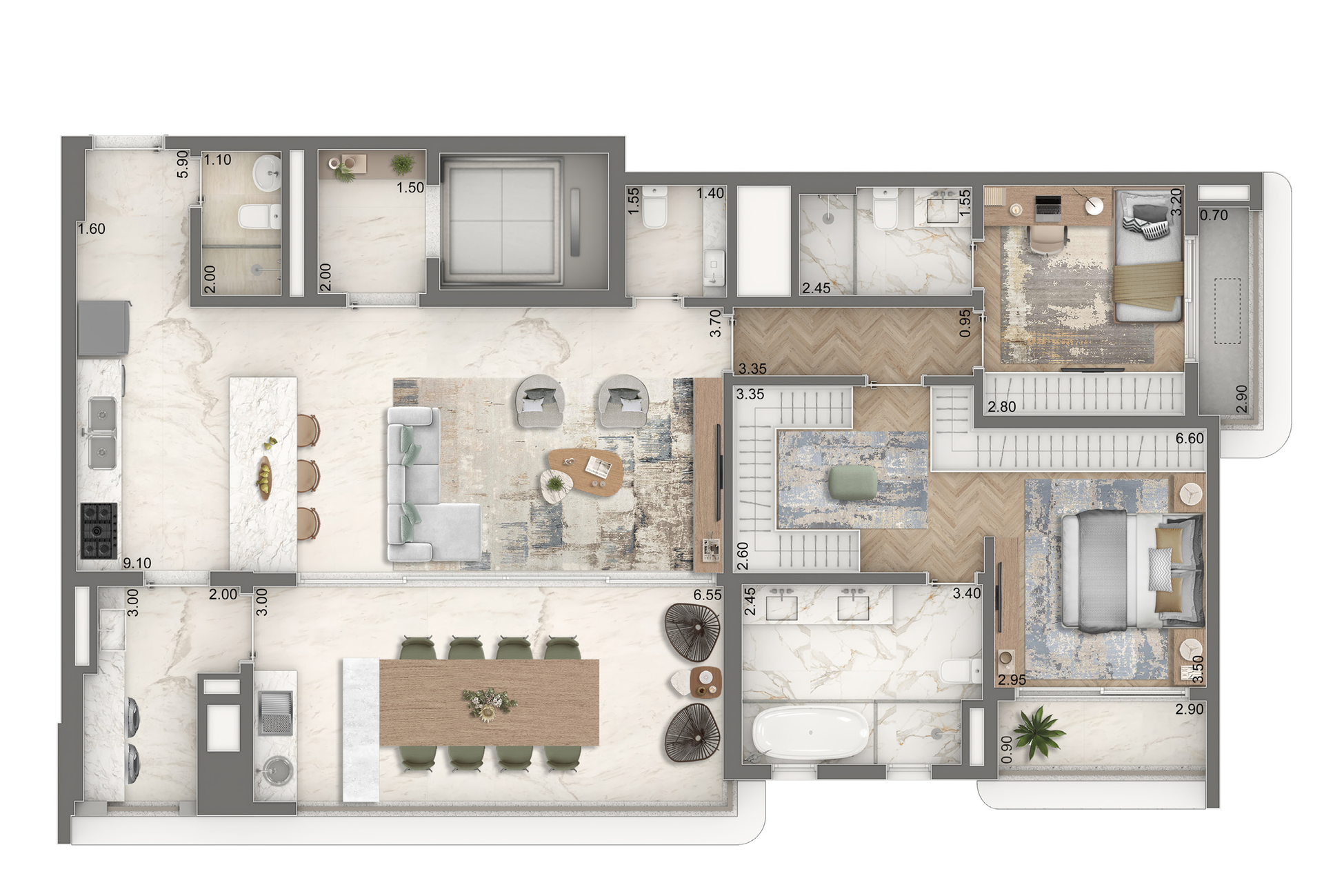 *Para os finais 6 e 7 do 2º pavimento, finais 5 e 6 do 8º pavimento e finais 4, 5, 6 e 7 do 9º ao 20º pavimento, será entregue uma vaga vinculada. Para os apartamentos a partir de 76 m² e para os finais 3 e 8 do 18º ao 20º pavimento será entregue uma vaga com direito de uso.