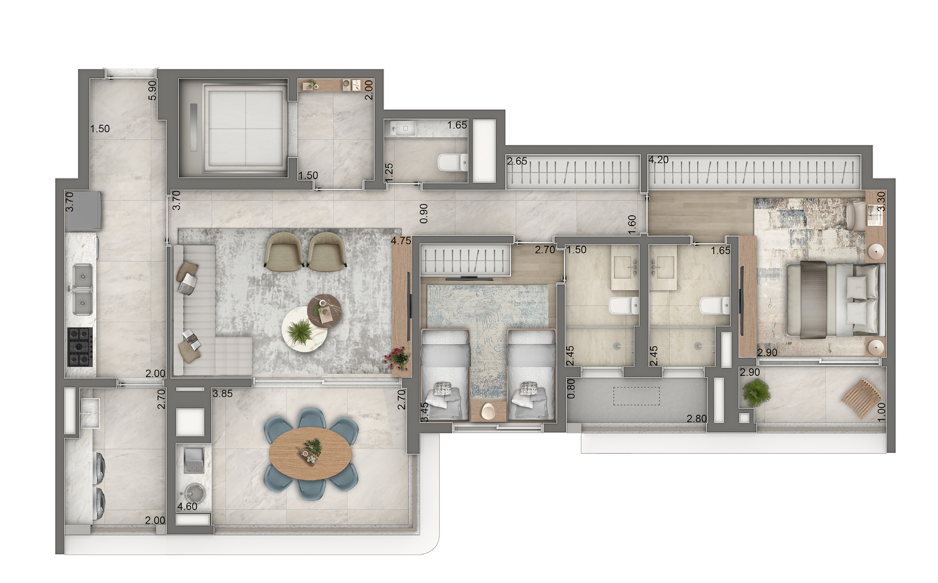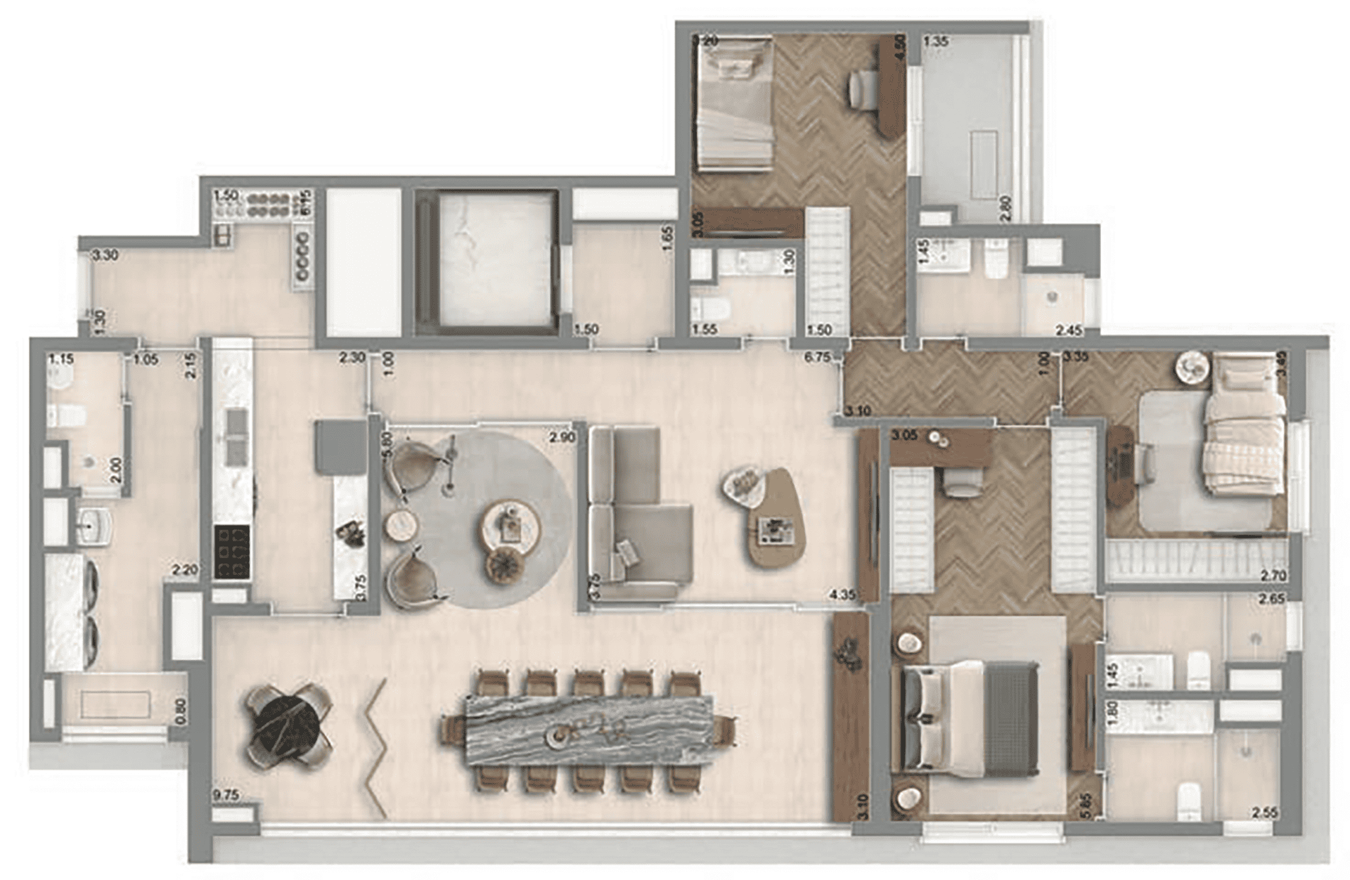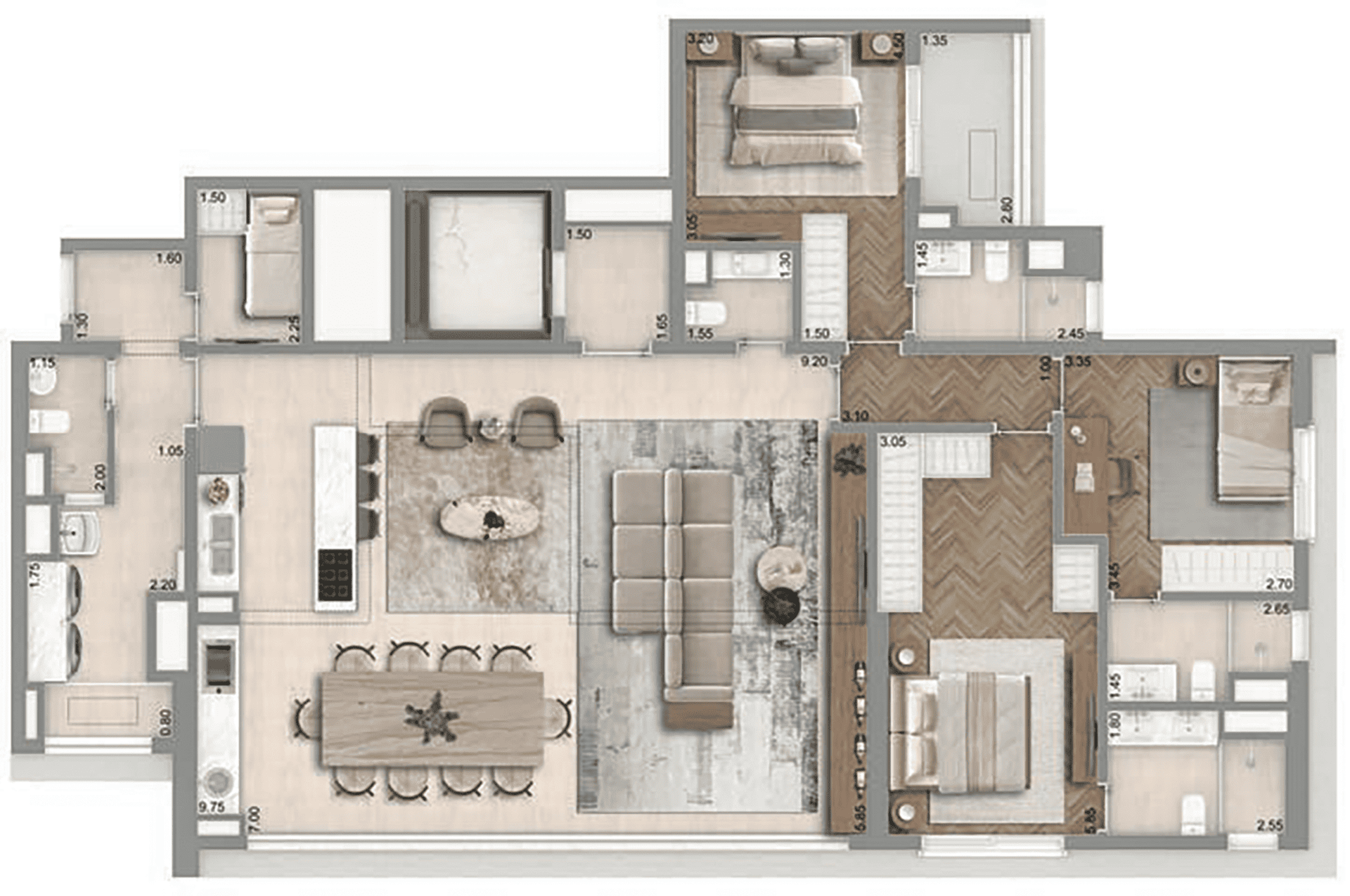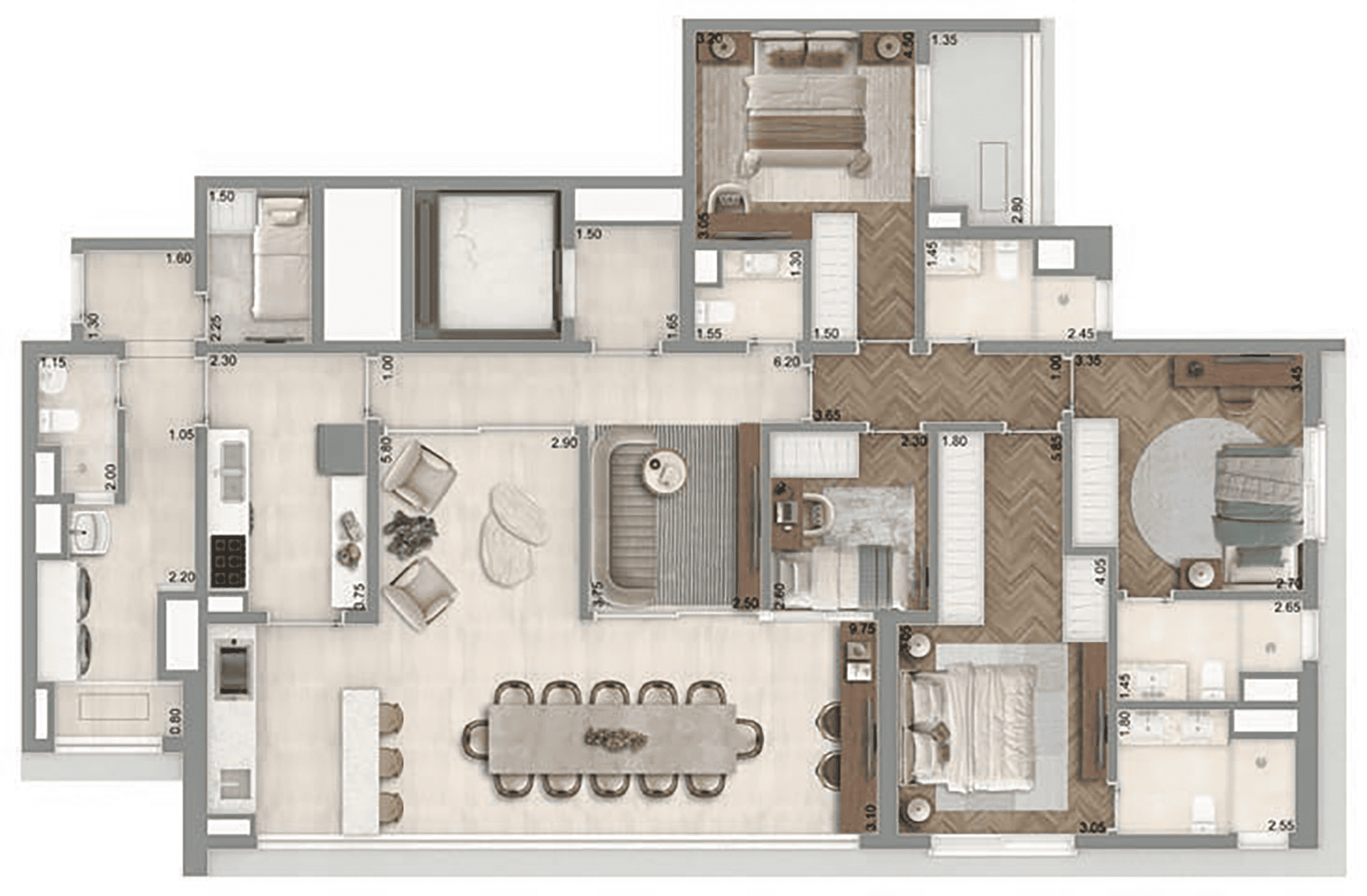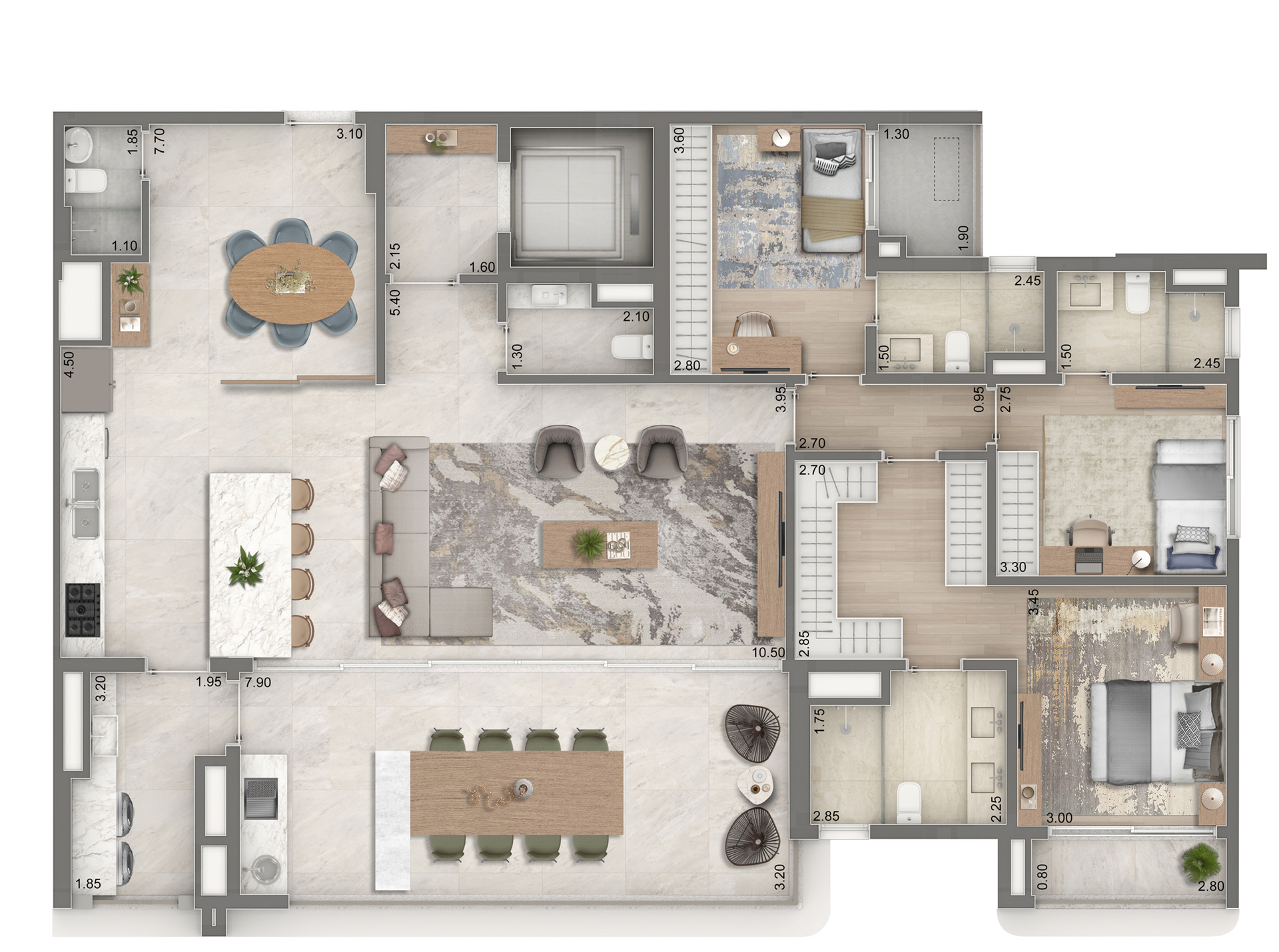*Para os finais 6 e 7 do 2º pavimento, finais 5 e 6 do 8º pavimento e finais 4, 5, 6 e 7 do 9º ao 20º pavimento, será entregue uma vaga vinculada. Para os apartamentos a partir de 76 m² e para os finais 3 e 8 do 18º ao 20º pavimento será entregue uma vaga com direito de uso.