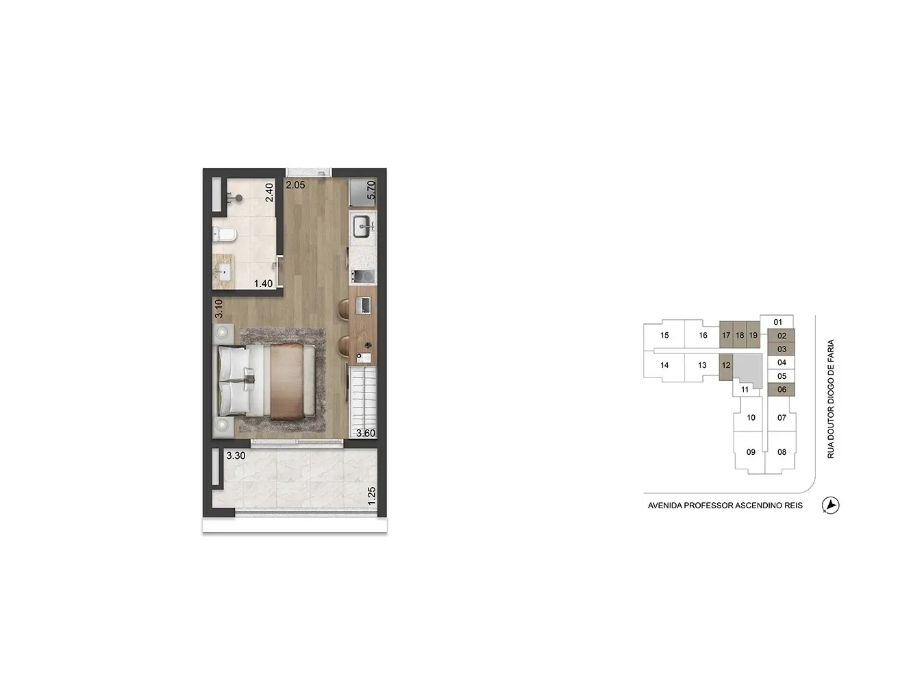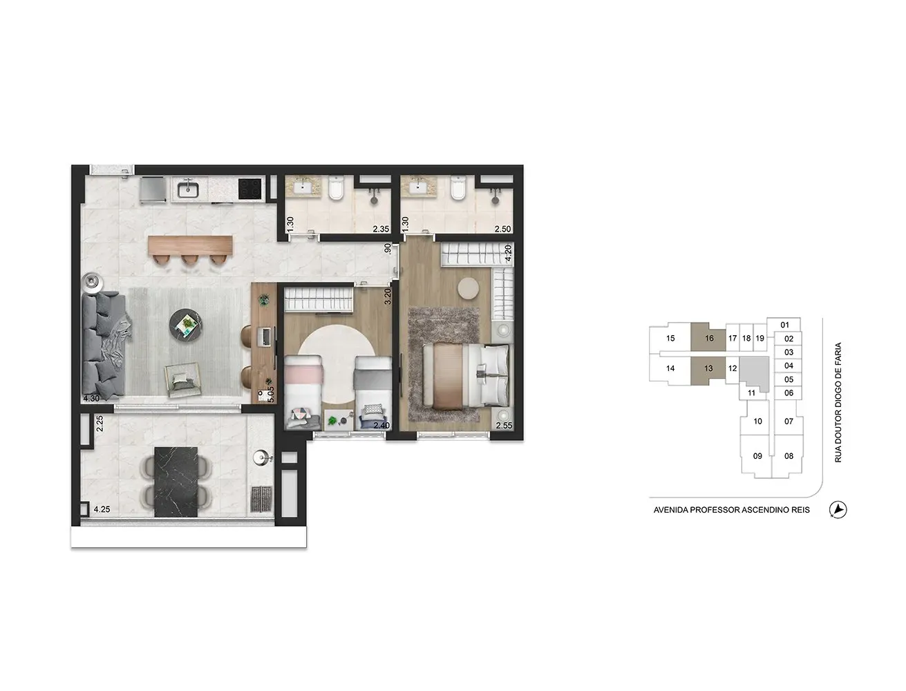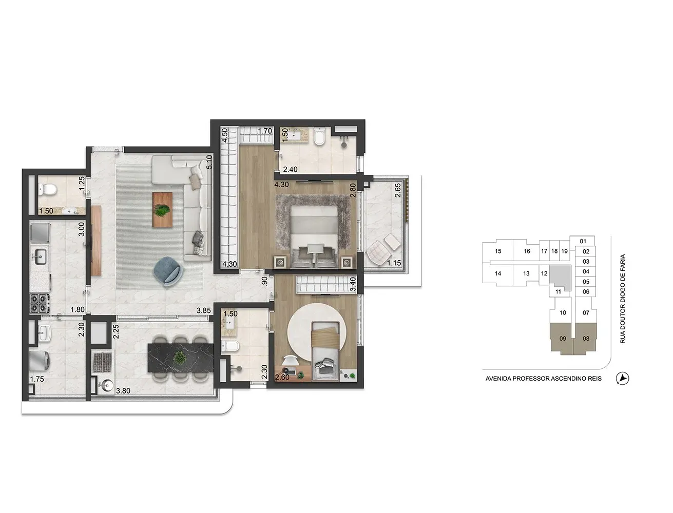 * Para os finais 7, 8, 9, 10, 13, 14, 15 e 16, do 3° ao 15° pavimento, será entregue 1 vaga com direito de uso e do 16° ao 22°, 1 vaga vinculada.