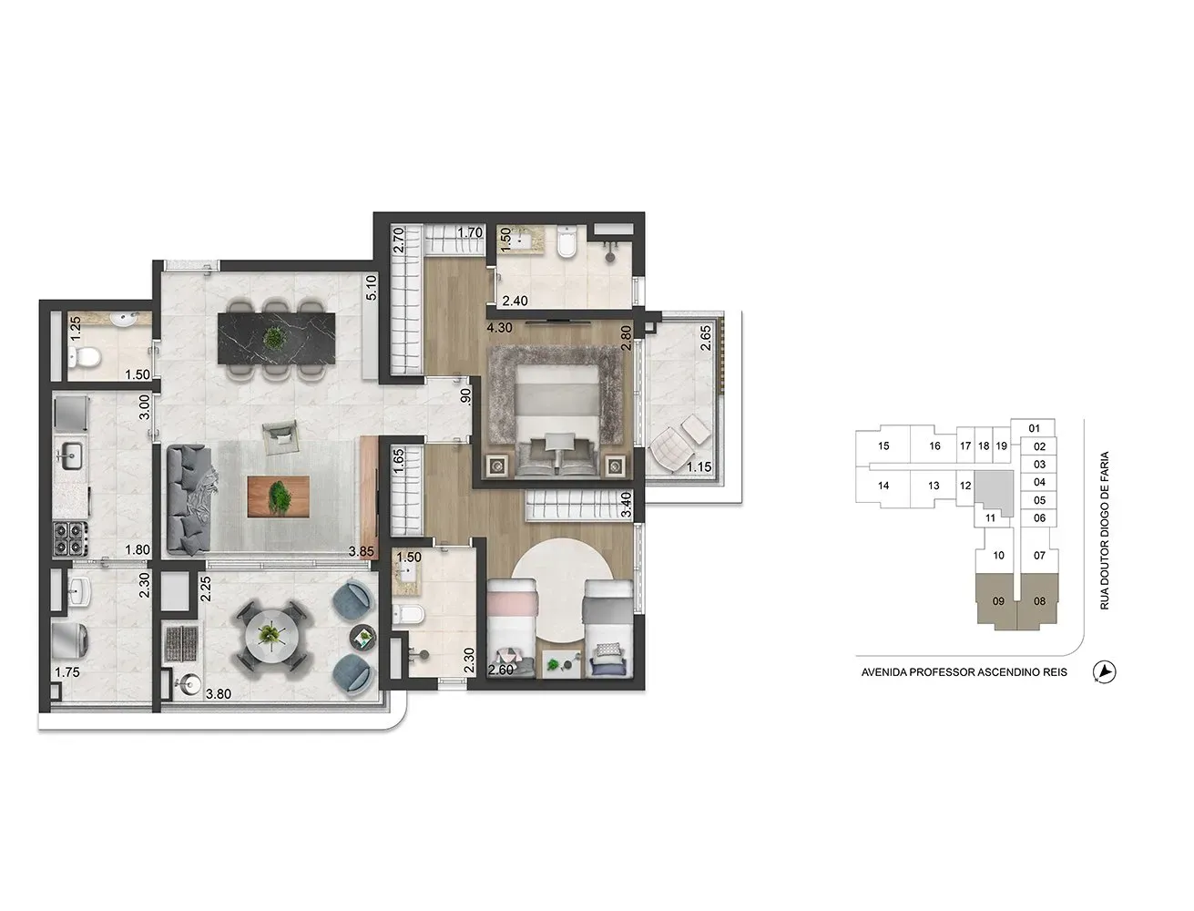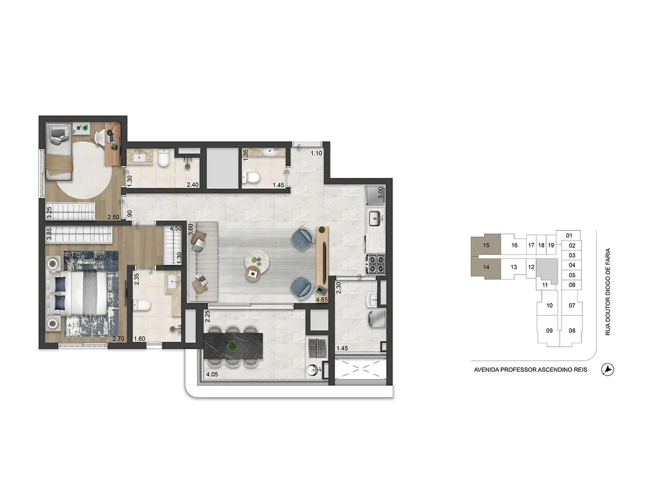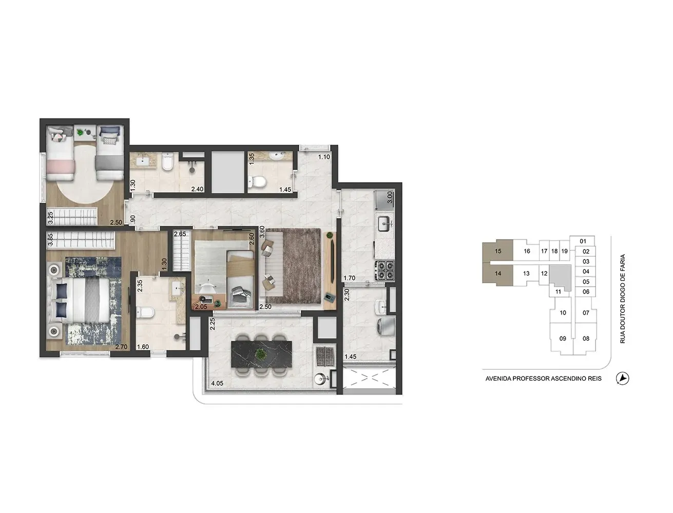 * Para os finais 7, 8, 9, 10, 13, 14, 15 e 16, do 3° ao 15° pavimento, será entregue 1 vaga com direito de uso e do 16° ao 22°, 1 vaga vinculada.