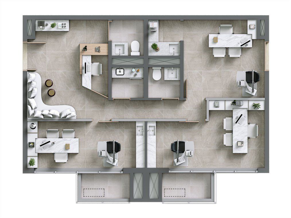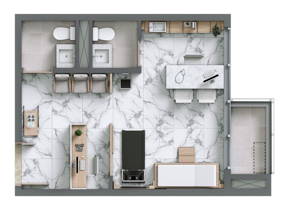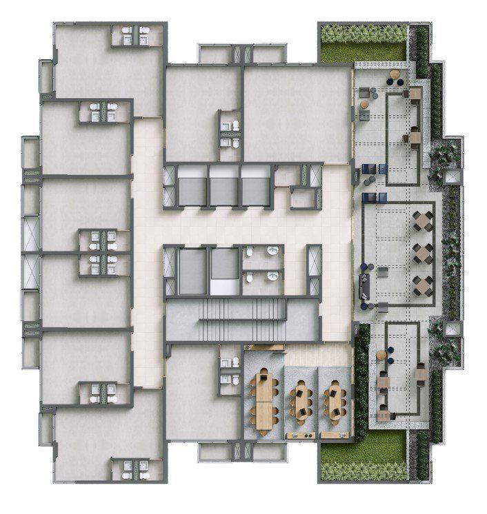 Dois banheiros por consultório e banheiros com acessibilidade nas áreas comuns, em todos os pavimentos.