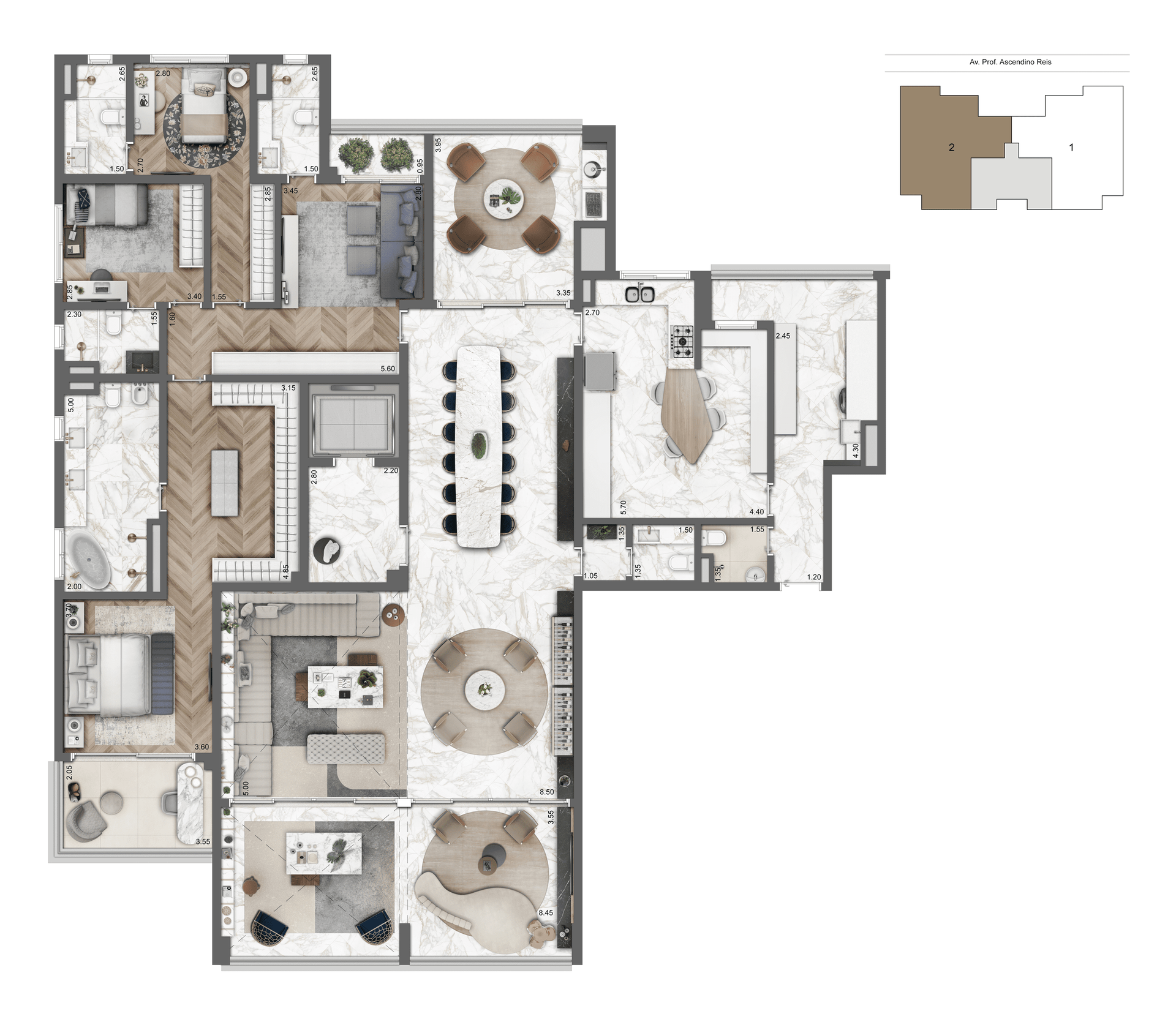 Apartamentos de 307 a 455m², 4 suítes, 3 a 4 dormitórios.